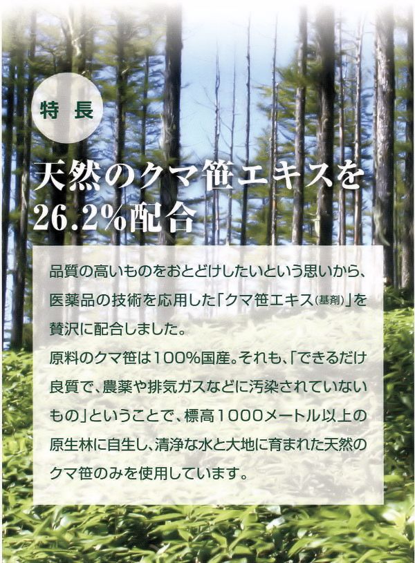 長い間クマ笹の研究を重ねた(株)大和生物研究所の「ササヘルス クマ笹エキス(基剤)」を使用しています。
